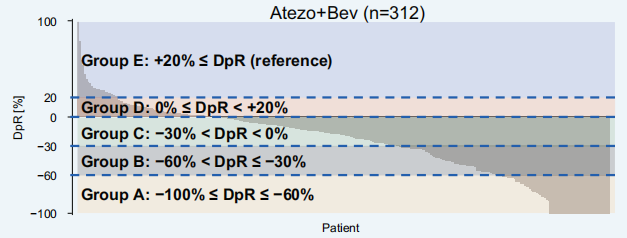 Dr.Kudo:There are three key factors in evaluating response:objective response,Depth of Response(DpR),and Duration of Response(DoR).Objective response is well known for its correlation with OS.Depth of Response measures how much tumor shrinkage is achieved and is classified into five grades.Grade A represents shrinkage from 60%to 100%,Grade B from 30%to 60%,Grade C from 0%to 30%,Grade D ranges from no change to 20%growth,and Grade E includes growth beyond 20%,indicating progressive disease.Stable disease includes shrinkage below 30%up to 20%growth.This depth classification allows us to assess how significantly the tumor has shrunk.