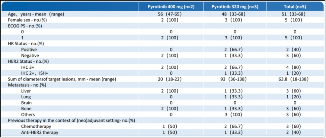 截至2024年6月28日,中位随访时间为3.5个月(范围:0.7-5.4个月)。5名HER2阳性转移性乳腺癌患者接受了T-DXd(5.4mg/kg,Q3W)与吡咯替尼(400mg,n=2或320mg,n=3)作为起始剂量的联合治疗,患者中位年龄为47岁(范围:33-68岁),所有患者ECOG体力状态评分(PS)为1,其中60%(3/5)患者存在内脏转移。唯一的DLT为1例接受400mg吡咯替尼的患者在第一周期中出现的3级厌食。经安全监察委员会(SMC)评估后,剂量探索进入第二队列,即吡咯替尼剂量降至320mg,T-DXd剂量保持不变,该队列3名患者用药第一周期均未出现DLT。