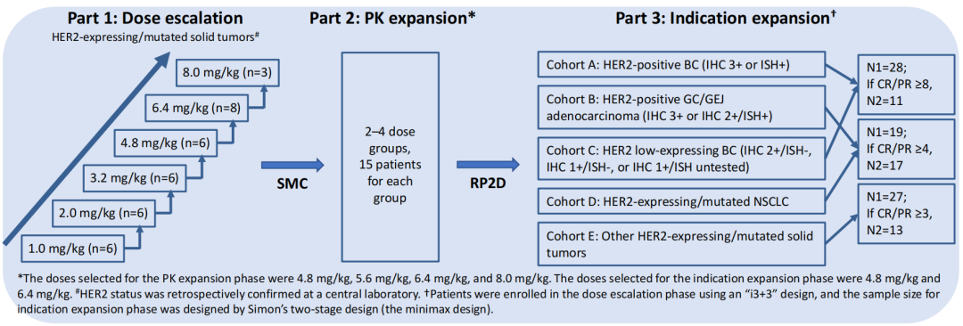 本研究的入组患者为HER2表达或突变的不可切除、晚期或转移性实体瘤患者,且对标准治疗有耐药性或不耐受。SHR-A1811给药剂量为1.0至8.0 mg/kg,每3周静脉注射一次。主要终点包括剂量限制性毒性、安全性和II期推荐剂量(RP2D)。