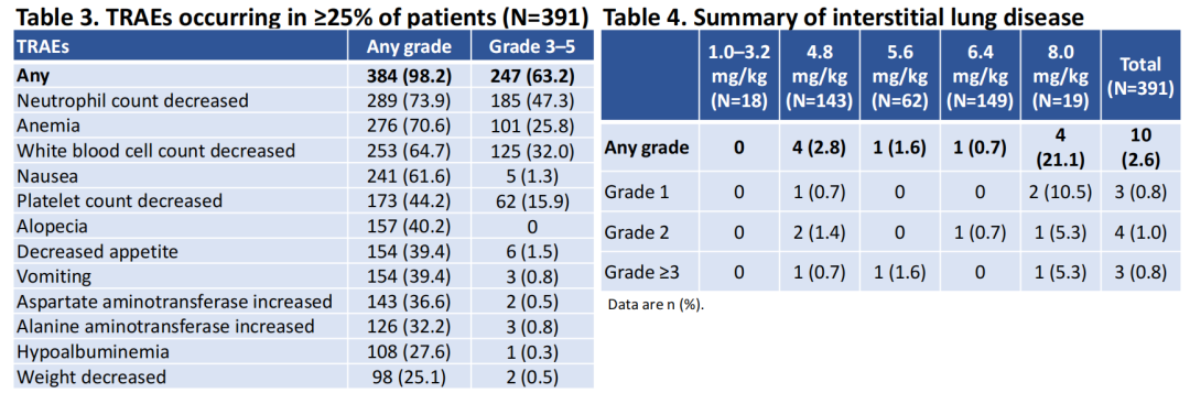 截至数据截止日期(2024年2月29日),HER2阳性乳腺癌、HER2低表达乳腺癌和非乳腺肿瘤的中位随访时间分别为13.4个月、9.5个月和6.3个月。不良事件在发生率、严重性和特异性方面与既往报道保持一致。没有发现新的安全性信号。247例(63.2%)患者报告了3级治疗相关不良事件(TRAEs),26例(6.6%)患者因TRAEs停止治疗。间质性肺病的发生率较低,仅有10例(2.6%)患者,且主要为1级或2级。