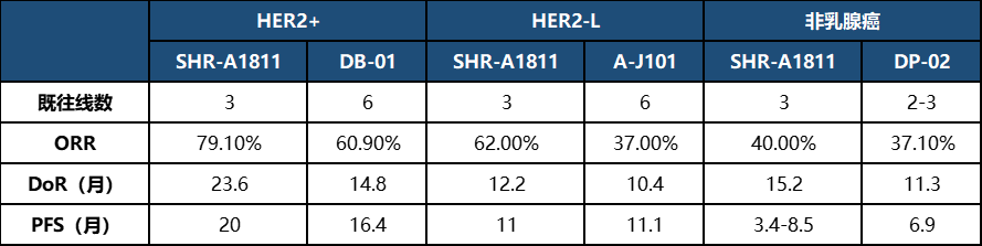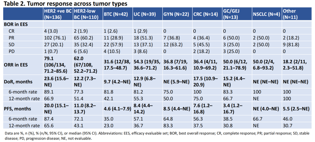 在肿瘤反应可评估的患者中,HER2阳性乳腺癌经确认的客观缓解率(ORR)为79.1%(95%CI:71.2~85.6),HER2低表达乳腺癌为62.0%(95%CI:52.2~71.2),非乳腺肿瘤为40.0%(95%CI:31.5~49.0);中位持续缓解时间(DoR)分别为23.6个月(95%CI:15.6~NE)、12.2个月(95%CI:7.3~NE)和15.2个月(95%CI:9.9~20.9)。HER2阳性和HER2低表达乳腺癌患者的中位PFS分别为20.0个月(95%CI:15.1~NE)、11.0个月(95%CI:8.2~13.7),各种非乳腺癌实体瘤的中位PFS范围为3.4至8.5个月。
