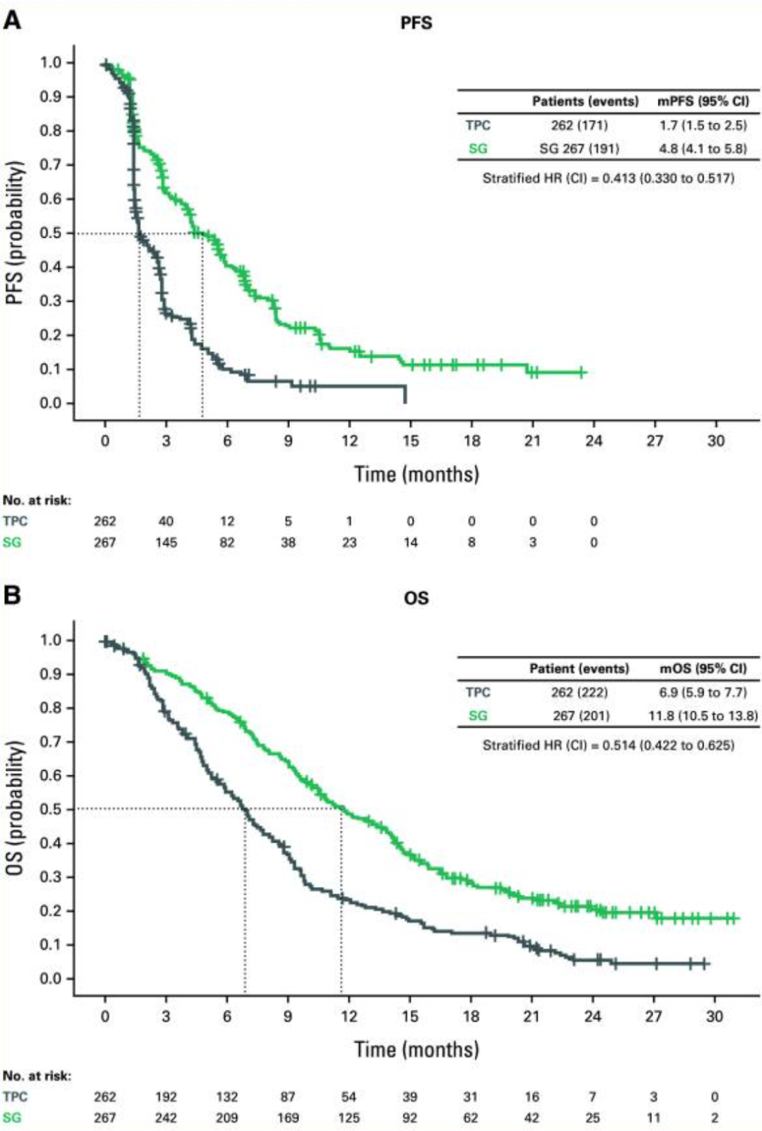 第三,在HR+/HER2-乳腺癌方面:TROPiCS-02研究已经证实了SG在HR+/HER2-晚期乳腺癌二线及其后应用的疗效及安全性[4]。2024年10月,《Nature Medicine》在线发表了徐兵河院士领衔的亚太多中心3期EVER-132-002研究,验证了SG在包括中国大陆等HR+/HER2-乳腺癌亚裔人群中的疗效和安全性。该研究显示SG较TPC可以显著改善mPFS,为4.3 vs 4.2个月(图3),降低33%的疾病进展或死亡风险(HR,0.67 95%CI:0.52-0.87,P=0.0028);也显著改善mOS,为21.0个月vs.15.3个月,降低36%的死亡风险(HR,0.64,95%CI:0.47-0.88,P=0.0061),未见新的不良反应信号[5]。