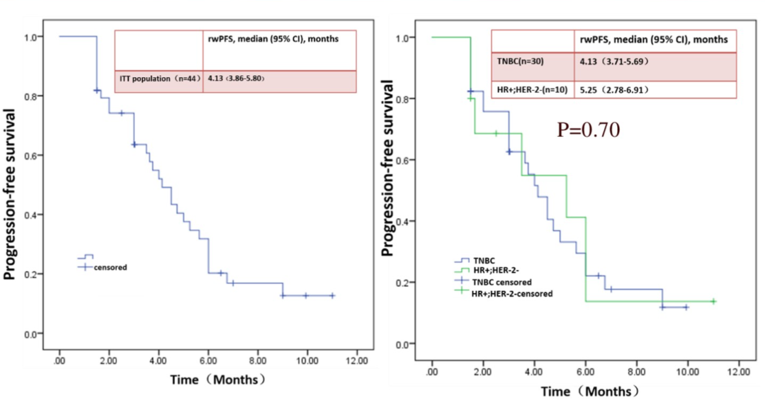 从2023年6月到2024年6月,本研究共纳入了我国5家中心44例患者,中位年龄53岁,患者在转移阶段接受了中位前序3线治疗。77.3%的患者为TNBC,22.7%的患者为HR+/HER2-乳腺癌,90%的HR+/HER2-乳腺癌患者接受过CDK4/6i治疗,且大多存在内脏转移。结果显示,所有患者rmPFS为4.13个月,TNBC的rmPFS为4.13个月,HR+/HER2-的rmPFS为5.25个月(图6),未见新的不良事件报道[10]。由此可见,在真实世界中,SG用于HER2-乳腺癌的后线应用显示了良好的治疗效果和安全性,再次在中国患者中证实了SG的效果,为真实世界应用SG积累了经验。