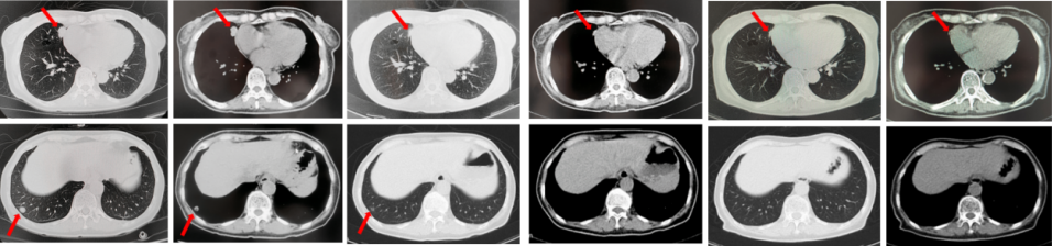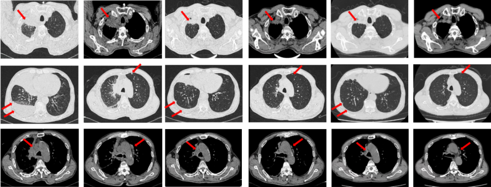 图1:由左至右分别展示基线(A.)及一线治疗后改变(B.和C.)。红色箭头指示病灶位置,由上至下分别为右肺肿物、右侧胸膜转移病灶及胸腔积液、左侧胸膜转移病灶、多发纵隔淋巴结肿大。