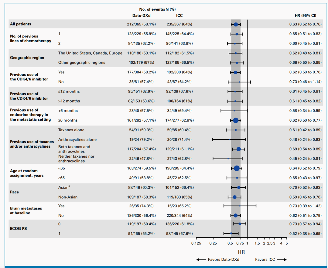 此次日本批准Dato-DXd的首个乳腺癌相关适应症,主要基于全球多中心III期TB-01研究。该研究入组732例接受过1-2线化疗的HR+/HER2+晚期乳腺癌(其中超过80%的患者接受过CDK4/6i治疗),随机接受Dato-DXd(365例)或研究者选择的化疗(367例)。今年发表于JCO的数据[4]显示,该研究已经达到其中一个主要终点:Dato-DXd可相较于化疗显著延长患者的无进展生存期(BICR评估:6.9 vs 4.9个月,HR 0.63,95%CI:0.52–0.76,P<0.0001),疾病进展或死亡风险降低37%;而且无论是否使用过CDK4/6i、既往CDK4/6i(≤12个月或>12个月)或内分泌治疗时间(≤6个月或>6个月)长或短、是否存在脑转移等亚组患者,均显示了一致的PFS获益。