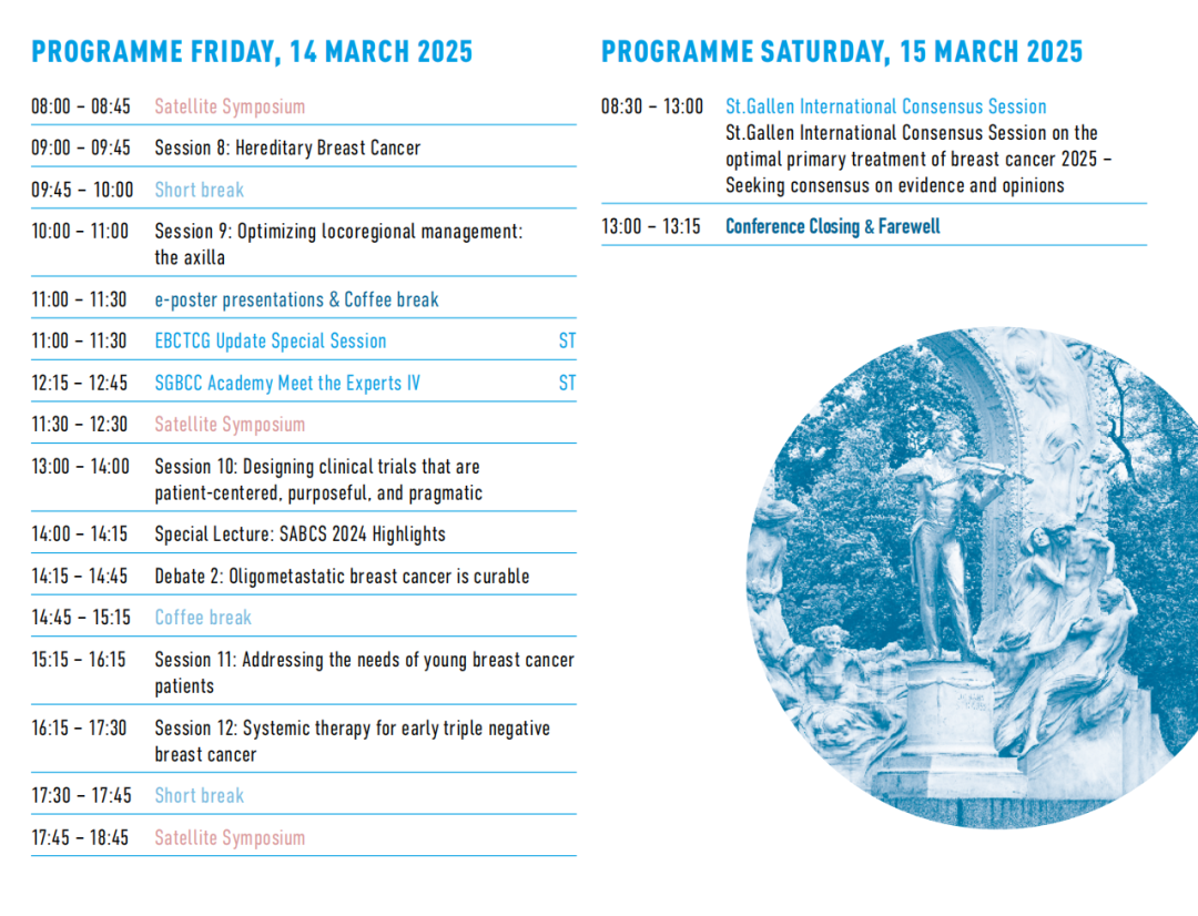 第19届圣加伦(St.Gallen)国际乳腺癌大会(SGBCC 2025)将于2025年3月12日~15日在奥地利维也纳盛大召开。当维也纳的旋律悠扬响起,激荡着世界的每一个角落,科学与艺术在这座开放包容的城市中交流、碰撞、融合,绽放出无比璀璨的光芒。圣加伦国际乳腺癌大会,这一科研盛事,已在维也纳扎根近40载,从音乐艺术的殿堂到科研艺术的舞台,始终与全球乳腺癌领域的发展同频共振。本届大会上,来自世界各地的乳腺癌专家将齐聚一堂,共同探讨最前沿、最具争议的早期乳腺癌诊治话题。他们将以深厚的学术功底和丰富的临床经验,为每两年一更新的St.Gallen早期乳腺癌国际专家共识贡献智慧与力量。