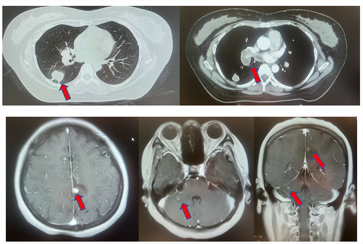 图1:上两图分别展示基线肺CT肺窗及纵隔窗影像,下三图表示脑MRI影像。红色箭头指示病灶位置,分别为右肺肿物、右侧肺门转移病灶、左侧顶叶病灶、右侧小脑病灶及冠状面上的颅内两个病灶。