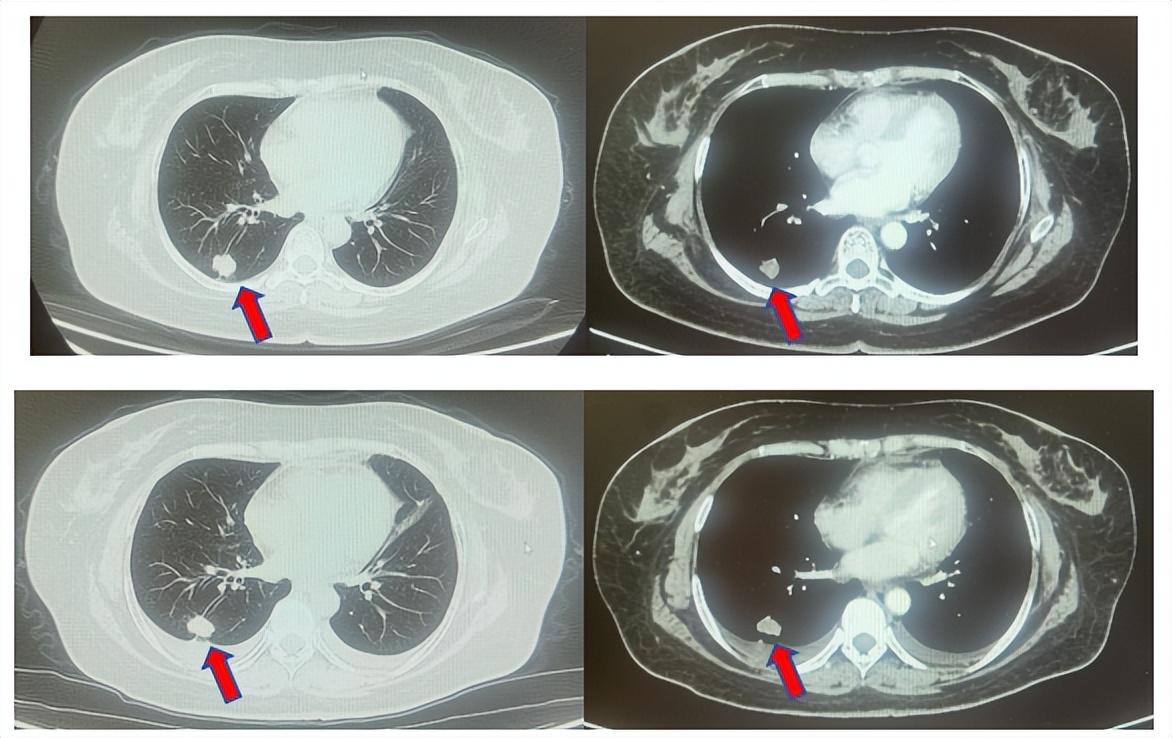 图3:上两图分别展示2024年1月患者一线进展时肺CT肺窗及纵隔窗肺内病灶影像,下两图表示2024年12月患者二线治疗间期评效时肺CT肺窗及纵隔窗肺内病灶影像