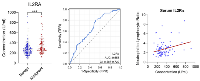 血清IL2Rα显著升高:乳腺癌患者血清IL2Rα浓度显著高于良性病变组(恶性组336.9 U/ml vs.良性组275.8 U/ml,P<0.001),诊断效能达中等水平(AUC=0.650)。血清IL2Rα水平与全身炎症指数中性粒细胞与淋巴细胞比值(NLR)相关(P=0.011)。