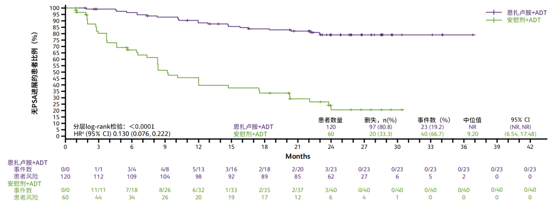 China ARCHES研究是一项针对初治mHSPC患者的III期临床研究。该研究将接受ADT联合恩扎卢胺治疗的患者试验组,而传统的单药ADT疗法作为对照组。研究结果显示在ADT联合恩扎卢胺能够显著延长疾病的控制时间,包括使PSA进展风险显著降低87%(HR 0.130,95%CI:0.076-0.222,P<0.0001),使影像学疾病进展或死亡风险显著降低67%(HR 0.330,95%CI:0.196-0.556,P<0.0001)等[5]
