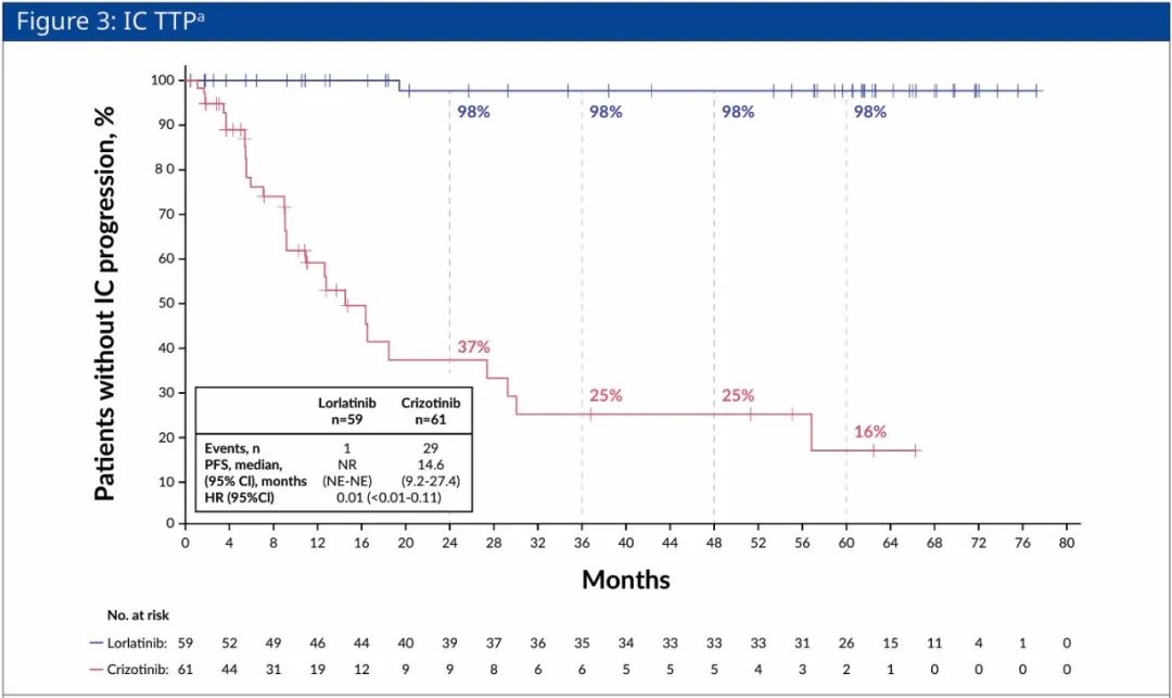 除此之外,洛拉替尼组的中位IC-TTP为NR(95%CI:NR-NR),而克唑替尼组为14.6个月(95%CI:9.2-27.4)(HR=0.01;95%CI:0.01-0.11),意味着洛拉替尼可持久控制颅内疾病进展。HR低至0.01,即相对于克唑替尼,洛拉替尼可降低颅内疾病进展风险高达99%,这对于提升患者生活质量与延长生存期具有重大意义。更值得注意的是,洛拉替尼组的无颅内进展率为97.6%,远高于克唑替尼组16%。