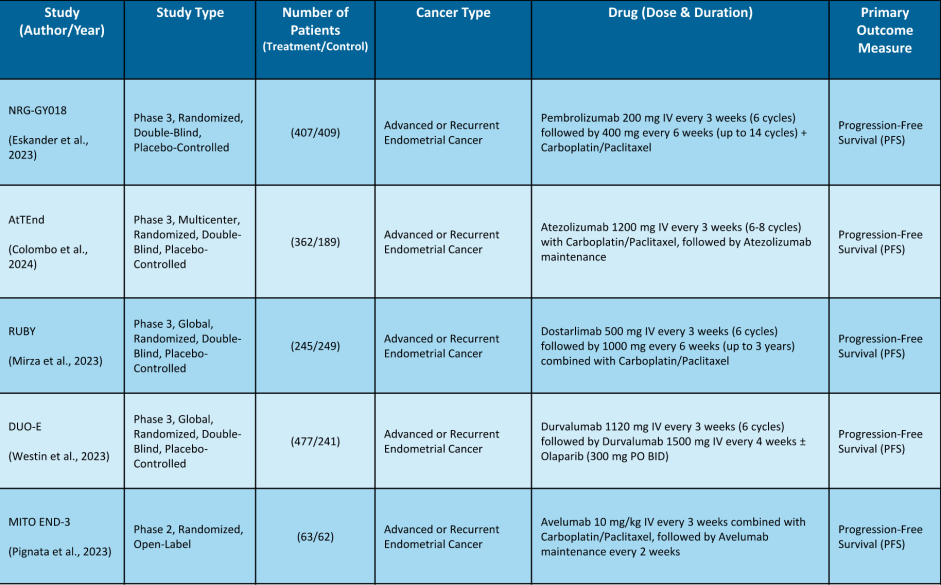 All five trials compared immunotherapy combined with chemotherapy versus placebo plus chemotherapy in primary advanced or recurrent EC.