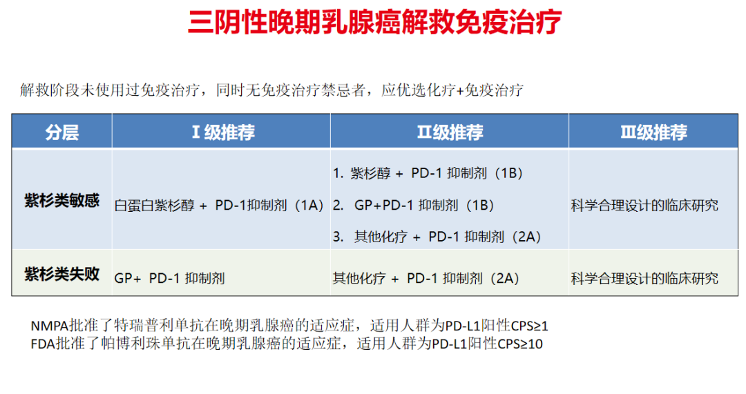 首先,三阴性晚期乳腺癌解救治疗仍然是分为两大板块进行治疗推荐的,第一部分是三阴性晚期乳腺癌解救化疗部分,第二部分是解救化疗联合免疫治疗部分。