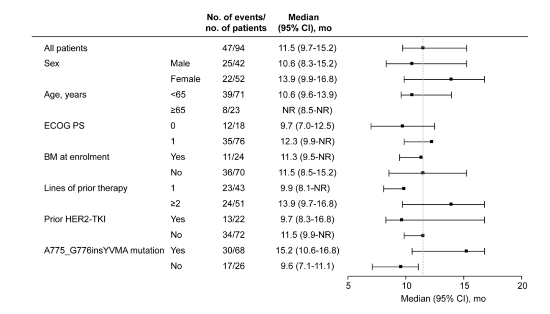 mPFS达到11.5个月,12个月的PFS率达到了48.6%。亚组分析显示,基线脑转移的患者中位PFS也达到了11.3个月,体现出脑转移患者能够从瑞康曲妥珠单抗中取得持久的肿瘤控制。既往经过抗HER2 TKI治疗的患者,中位PFS也达到了9.7个月。