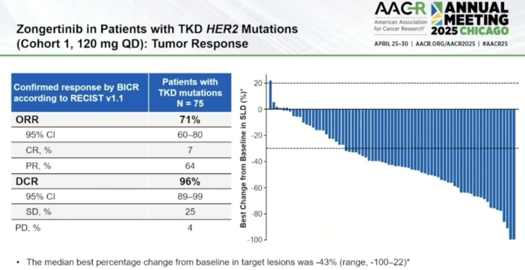 在队列1(n=75)中接受治疗的携带TKD HER2突变的患者中,ORR为71%(95%CI:60%-80%),其中完全缓解(CR)率为7%,部分缓解(PR)率为64%。疾病稳定(SD)和疾病进展(PD)的比例分别为25%和4%,疾病控制率(DCR)为96%(95%CI:89%-99%)。该队列基线靶病变的最佳变化中位数为-43%(范围:-100%-22%)。