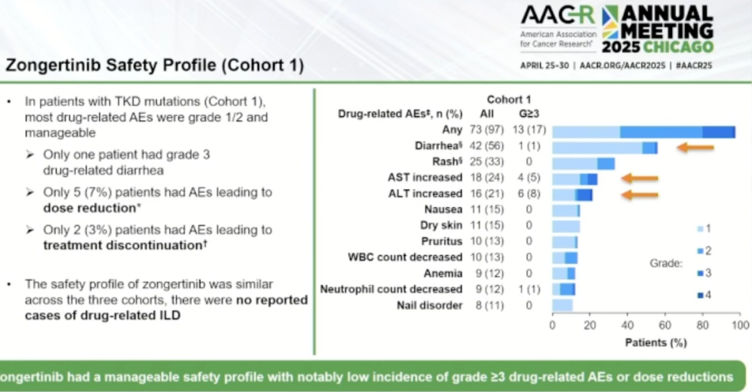 Zongertinib的安全性在队列1、3和5中保持一致,且未出现间质性肺疾病。在队列1中,携带TKD HER2突变的患者中,绝大多数不良反应(AE)轻微且可控,1名患者报告了治疗相关的3级腹泻。该队列中7%的患者因AE而减少剂量,3%的患者因AE而停止治疗。队列1中,任何级别和≥3级TRAE发生率分别为95%和17%。最常见的TRAE包括腹泻(任何级别,56%;≥3级,1%)、皮疹(33%;0%)、天冬氨酸氨基转移酶水平升高(24%;5%)、丙氨酸氨基转移酶水平升高(21%;8%)、恶心(15%;0%)、皮肤干燥(15%;0%)、瘙痒(13%;0%)、白细胞计数减少(13%;0%)、贫血(12%;0%)、中性粒细胞计数减少(12%;1%)和指甲疾病(11%;0%)。