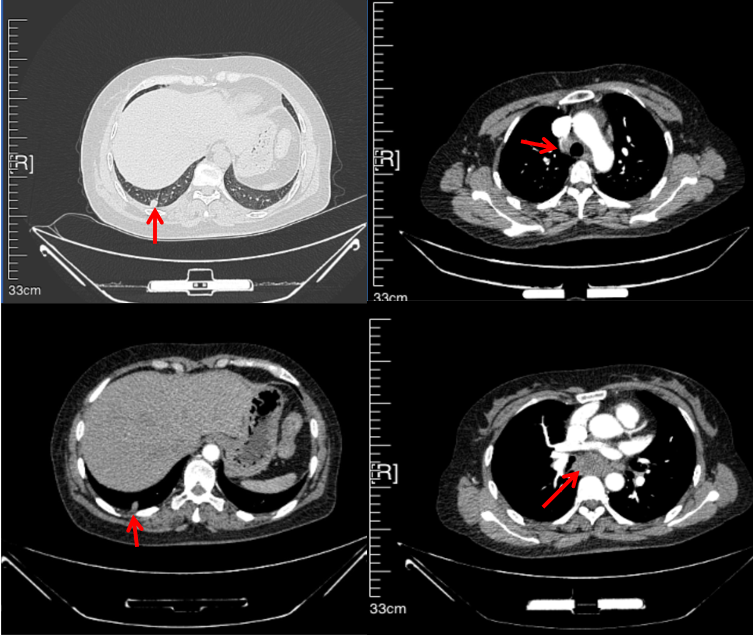 临床诊断:右肺上叶恶性肿瘤rT0N0M1a IVA期(第9版分期);恶性胸腔积液。