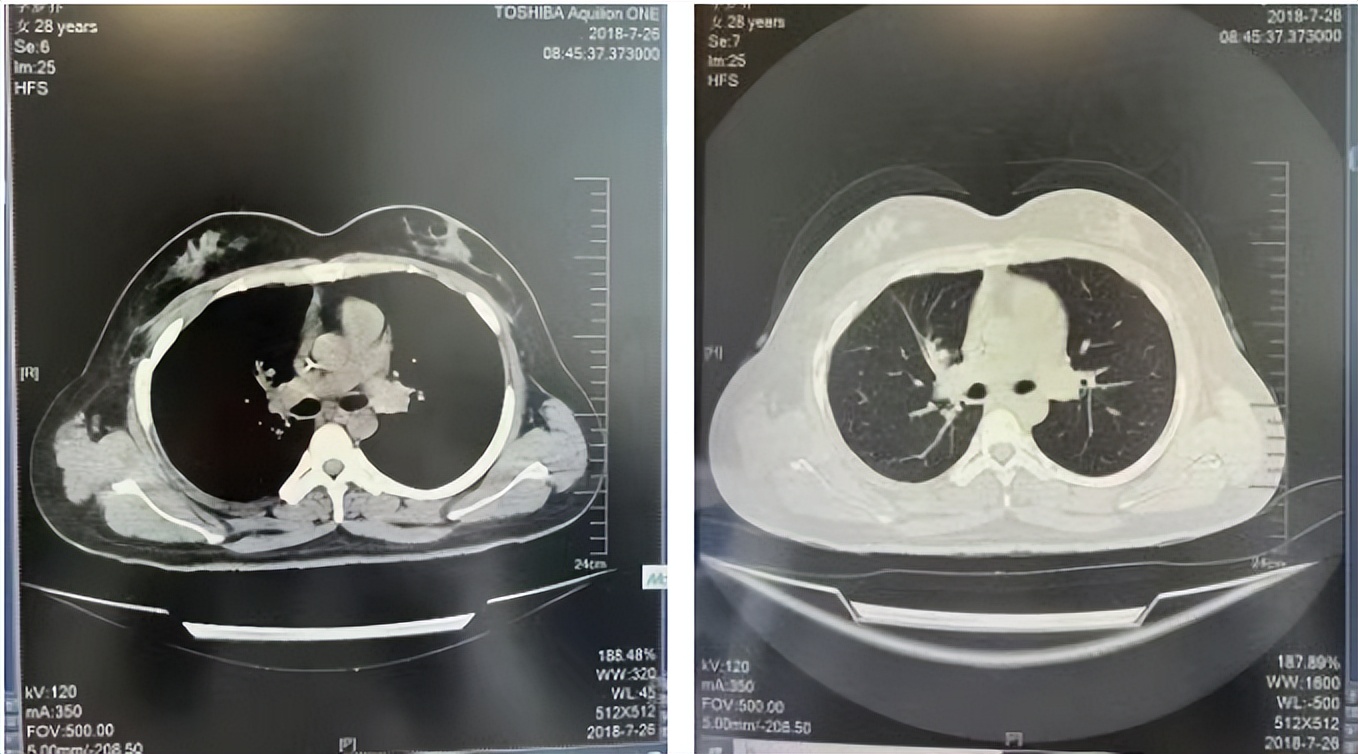 34岁,女性,无吸烟史饮酒史,既往体健。2015年11月无明显诱因出现咳嗽咳痰,痰为黄色粘液状,就诊于铁西华康医院,胸部CT示右肺上叶尖段可见结节影,邻近胸膜局限牵拉。2015年12月于胸科医院行肺肿物穿刺活检病理回报为肺腺癌。2015年12月16日全麻下行右肺上叶肺癌根治术及纵隔淋巴结清扫术,术后病理:肺组织中部分脉管内见腺癌组织,断端支气管旁淋巴结内见癌组织,淋巴结中见到转移癌(2/6),未行基因检测。
