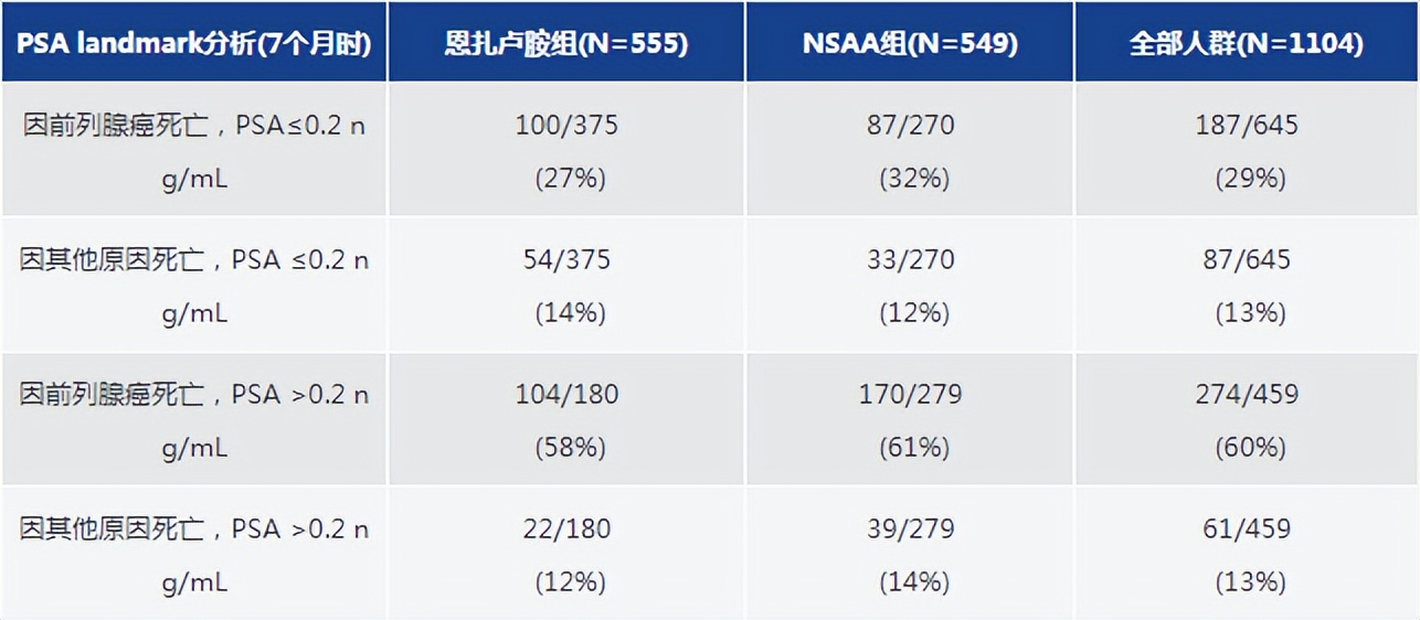622例死亡中,恩扎卢胺组前列腺癌相关死亡例数(207例)少于NSAA组(261例),其他原因导致的死亡在两组中相似(78 vs 76例)。