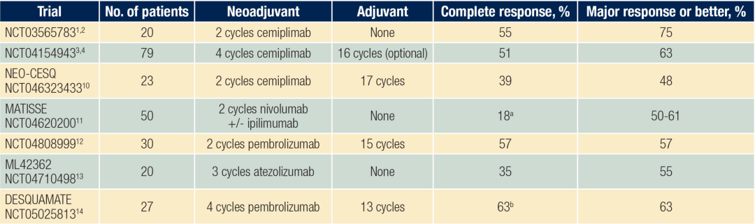其他几项评估新辅助IO的2期试验正在进行中,摘要中报告的初步数据支持相似的pCR和MPR率(见表1)[1-4,10-14]。值得注意的设计元素包括NEO-CESQ研究和Amatore等人的研究,其中包含1年的辅助IO;MATISSE试验,该试验有2个臂,分别是单独使用nivolumab或与ipilimumab联合使用;以及DESQUAMATE研究,该研究为达到临床完全缓解的患者提供降阶治疗[10-12,14]