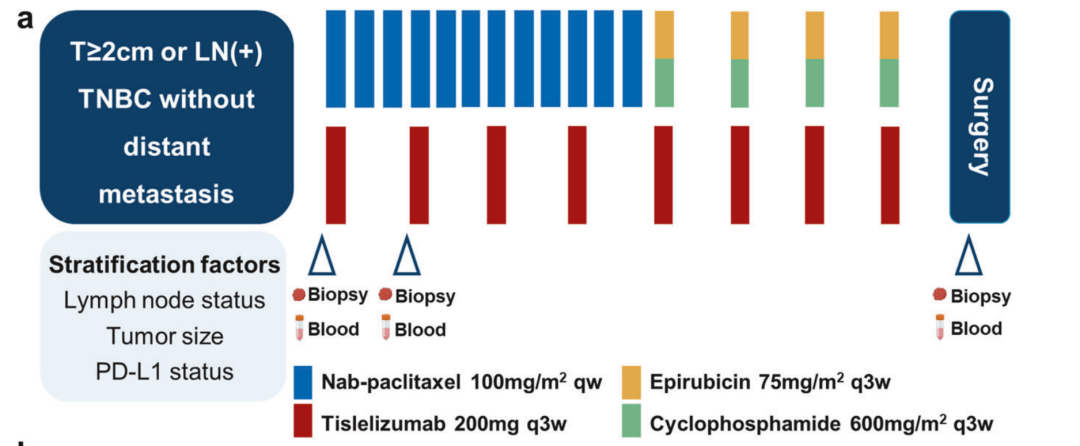 这项前瞻性、单臂、单中心、2期临床试验TREND,纳入患者为淋巴结阳性或至少T2的未治疗TNBC,所有患者均接受了替雷利珠单抗(PD-1抑制剂)新辅助免疫治疗,联合无铂、低剂量新辅助化疗方案治疗,即白蛋白-紫杉醇序贯表柔比星/环磷酰胺(NabP-EC方案)。主要终点为病理完全缓解(pCR),次要终点包括客观缓解率(ORR)和安全性。研究还对治疗前、后的肿瘤样本进行批量RNA测序、单细胞RNA测序、T细胞受体测序、全外显子测序及质谱流式细胞术分析。