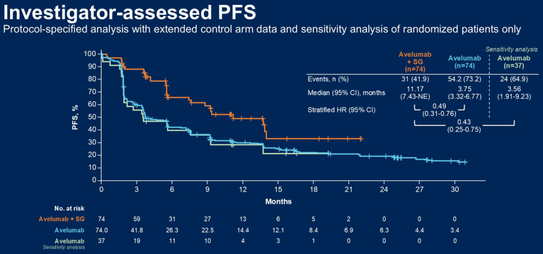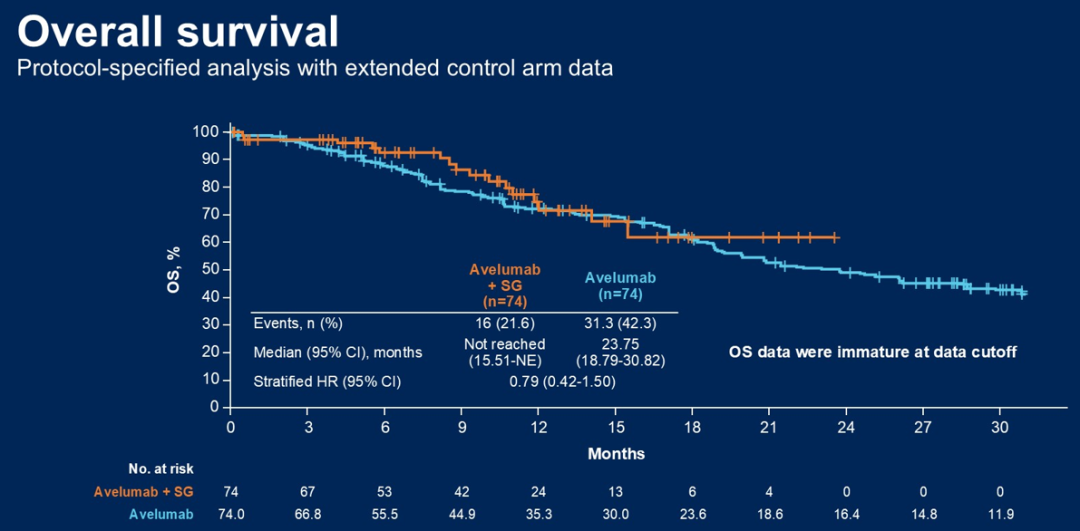 本次结果披露中,74例阿维鲁单抗+SG组中有38例(51.4%)仍接受治疗;37例阿维鲁单抗单药组中有10例(27.0%)仍接受治疗。两组中患者中位年龄分别为70岁和67岁,脏器转移比例分别为50.0%和51.4%,ECOG评分为1的比例阿维鲁单抗+SG组较低(31.1%vs 54.1%)。