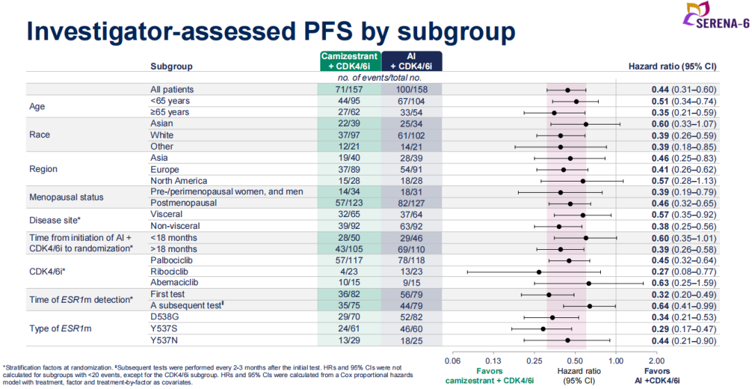 所有预设亚组(包括内脏转移状态、不同CDK4/6抑制剂、既往CDK4/6抑制剂+AI的使用时长、ESR1m检出时机、ESR1m类型等)均显示一致获益,证实Camizestrant的广泛适用性。