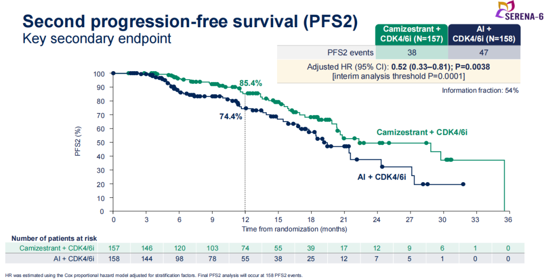 SERENA-4研究是针对既往未接受任何系统治疗的新诊断HR+/HER2-晚期乳腺癌患者的研究。该研究入组人群中,无论患者是否存在ESR1突变,都可以常规应用Camizestrant进行治疗。由此可见,该药物是一种更为强效的内分泌治疗药物。我认为,SERENA-4研究有望取得阳性的结果。