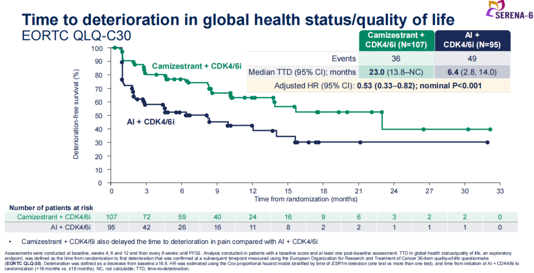 研究结果显示,对于接受AI联合CDK4/6抑制剂一线治疗期间出现ESR1突变但无疾病进展证据的HR+/HER2-晚期乳腺癌患者,转换为Camizestrant联合CDK4/6抑制剂治疗相比继续原方案,可显著延长PFS(16个月vs.9.2个月,aHR 0.44,95%CI:0.31-0.60;P<0.0001)以及至生活质量恶化时间(23.0个月vs.6.4个月,aHR 0.53,95%CI:0.33-0.82,P<0.001)。