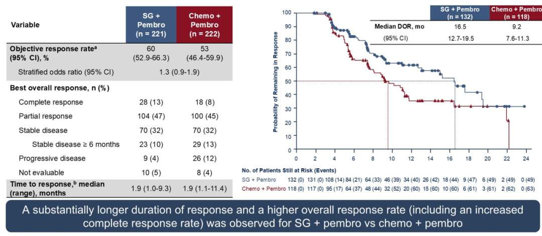 该研究共纳入了443名PD-L1阳性TNBC患者,按1:1随机分组后予以戈沙妥珠单抗联合帕博利珠单抗和化疗联合帕博利珠单抗方案。该研究达到了PFS的主要研究终点,与化疗联合帕博利珠单抗相比,戈沙妥珠单抗联合帕博利珠单抗降低了疾病进展或死亡风险达35%,具有统计学显著性和临床意义(11.2个月vs 7.8个月;HR 0.65,95%CI 0.51-0.84;P=0.0009)(图2上)。OS尚不成熟,但也展现了早期获益的趋势。戈沙妥珠单抗联合帕博利珠单抗方案具有更高的ORR(60%vs 53%),并显示出深度且持久的缓解(完全缓解:13%vs 8%;DOR 16.5个月vs 9.2个月)(图2,下)。安全性方面,与既往戈沙妥珠单抗及帕博利珠单抗研究一致,未见新的不良事件信号。患者耐受性较好,戈沙妥珠单抗联合帕博利珠单抗组与化疗联合帕博利珠单抗组的不良事件相关停药率为12%vs 31%,为更多患者可以完整接受治疗带来了保障。
