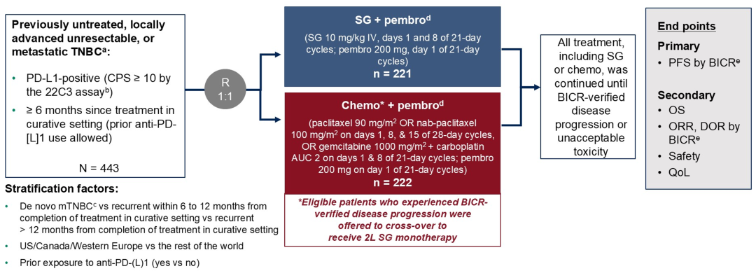 殷咏梅教授:ASCENT-04研究[2]是一项全球性、多中心、开放标签、随机Ⅲ期临床研究,主要针对既往未经晚期系统治疗、无法手术的PD-L1阳性(CPS≥10)局部晚期或转移性三阴性乳腺癌(TNBC)患者,评估戈沙妥珠单抗联合帕博利珠单抗vs化疗联合帕博利珠单抗一线应用的疗效和安全性。该研究的主要终点是经盲法独立中央审查(BICR)使用RECIST v1.1确定的无进展生存期(PFS)。次要终点包括总生存期(OS)、客观缓解率(ORR)、缓解持续时间(DOR)、缓解开始时间(TTR)、患者报告结局(PROs)和安全性(图1)。