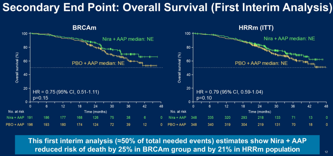 首次中期分析显示,OS趋势(193/389例事件)有利于尼拉帕利+AAP(HR,0.79,95%CI 0.59-1.04,P=0.10;BRCA1/2:HR 0.75,95%CI 0.51-1.11,P=0.15)。
