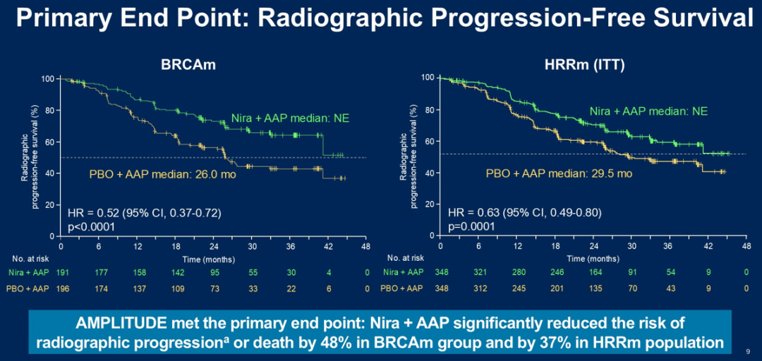 在整个研究人群中,与安慰剂加AAP相比,尼拉帕利加AAP组放射学进展或死亡的风险降低了37%(HR 0.63,95%CI 0.49-0.80;P=0.0001)。