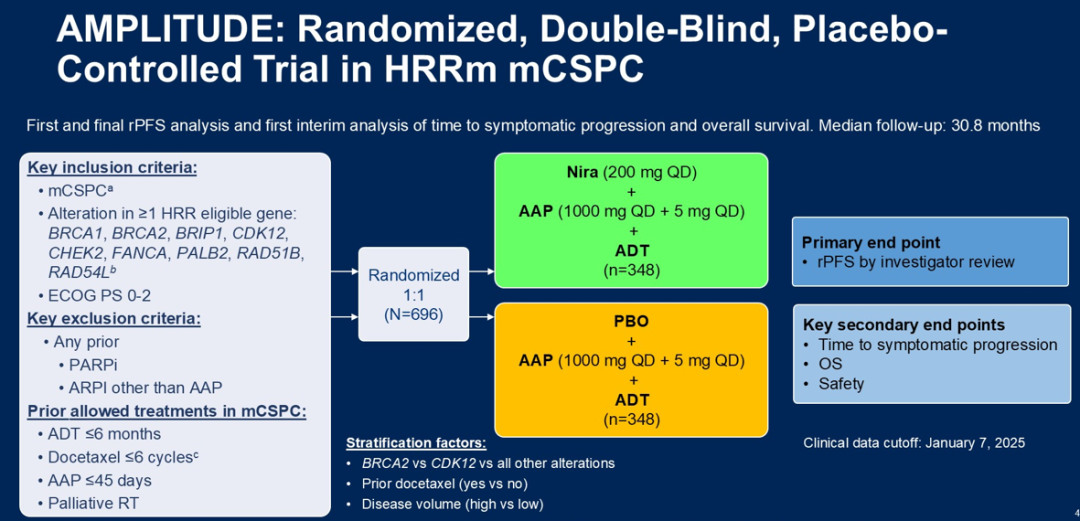 为了确定PARP抑制对去势敏感性疾病患者群体是否有效,启动了3期AMPLITUDE试验。AMPLITUDE将696名存在mCSPC和HRR基因变异的患者随机分配至尼拉帕利联合AAP治疗组(348名患者)或安慰剂联合AAP治疗组(348名患者)。患者既往接受的雄激素剥夺治疗不超过6个月和/或多西他赛治疗不超过6个周期。主要终点是研究者评估的rPFS;次要终点包括症状进展时间、OS和安全性结局。