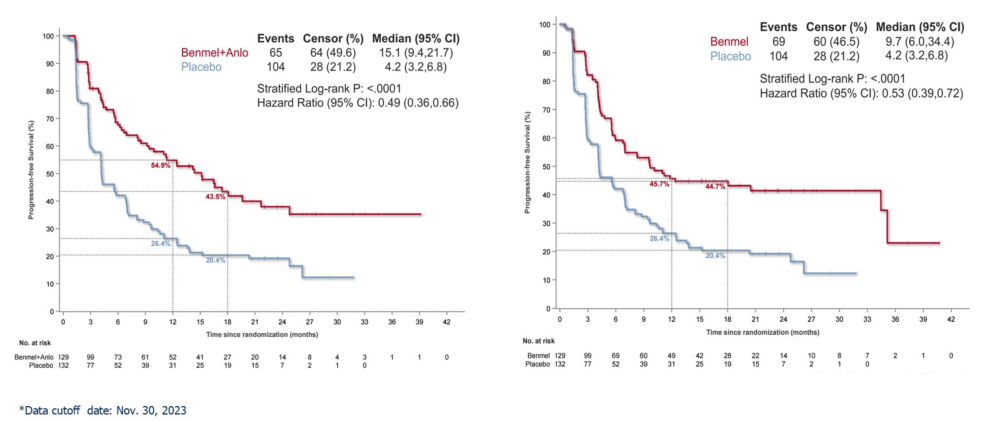 与安慰剂相比,贝莫苏拜单抗联合或不联合安罗替尼治疗均显著延长了患者的PFS。次要终点也显示出优效性,且治疗组的安全性特征仍在可接受范围内。