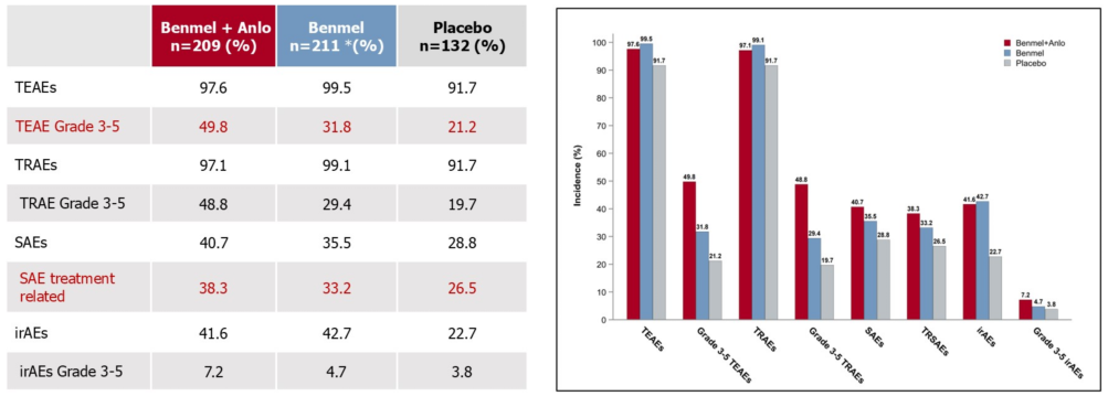 安全性:≥3级治疗期间不良事件(TEAEs)发生率:联合治疗组49.8%,单药治疗组31.8%,安慰剂组21.2%。最常见的不良事件包括高血压(8.6%vs.1.0%vs.1.5%)和高甘油三酯血症(9.6%vs.2.8%vs.1.5%)。因TEAEs导致治疗终止的比例:22.5%vs.14.2%vs.9.1%。