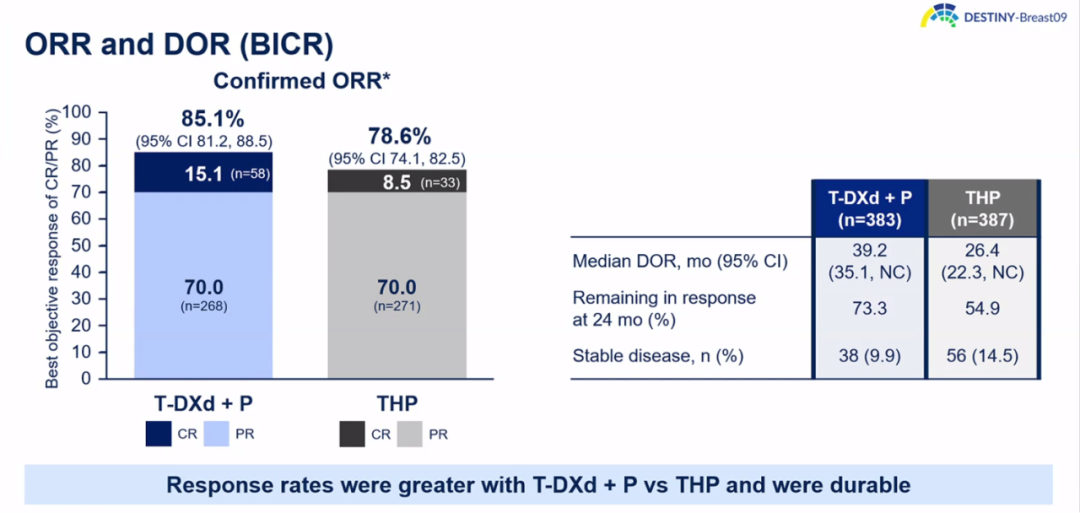 在近期疗效方面,T-DXd+帕妥珠单抗的客观缓解率(ORR)达到了85.1%,CR率较THP组提升了一倍,为15.1%vs 8.5%(图2)。我们对于此类CR的患者在未来获得较长时间的无瘤生存、甚至治愈具有更多的信心。我相信,DESTINY-Breast09研究将很快改写指南、改变临床实践,使T-DXd+帕妥珠单抗方案成功进入到HER2阳性乳腺癌的一线治疗标准方案中。