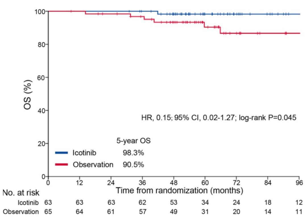 中位随访65.0个月显示,埃克替尼组vs观察组的5年DFS率为88.5%vs 67.7%,(log-rank P=0.012,HR=0.38;95%CI:0.18-0.83),埃克替尼降低了62%的疾病进展或死亡风险,首次证实了第一代EGFR-TKI在IB期NSCLC患者中的长期获益