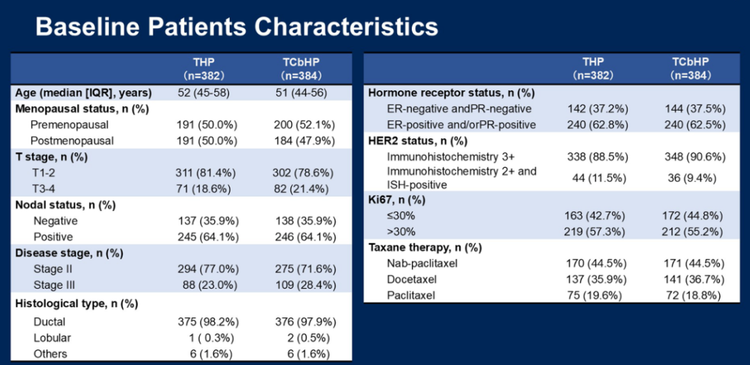 与TCbHP相比,THP提供了非劣效的pCR率,且耐受性更好。在存在双重HER2阻断的情况下,省略卡铂可能是一种有效的去强化新辅助治疗策略,适用于HER2阳性早期乳腺癌患者。