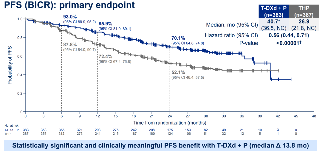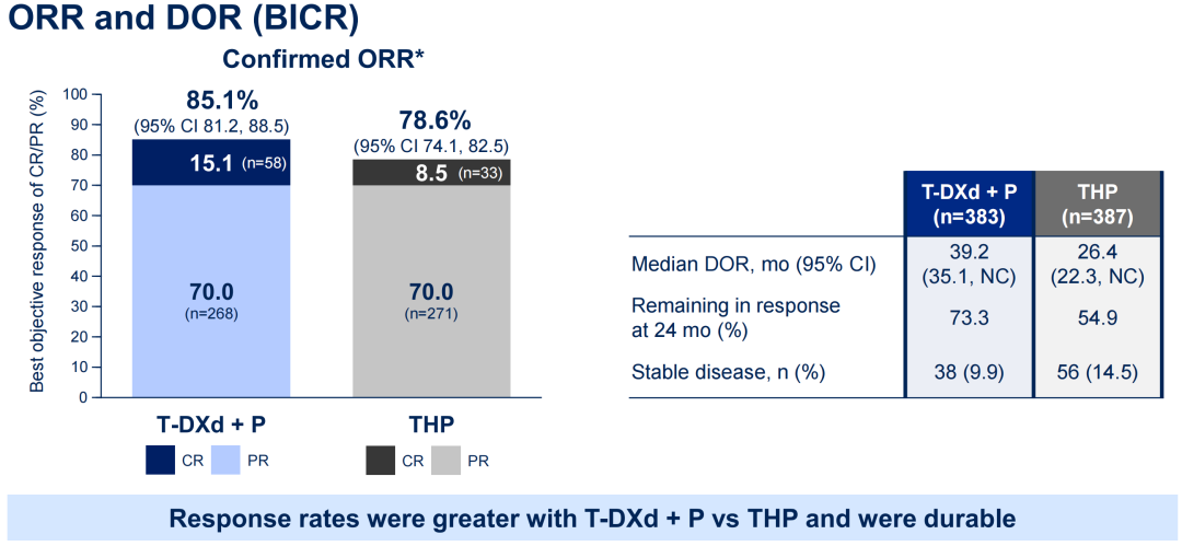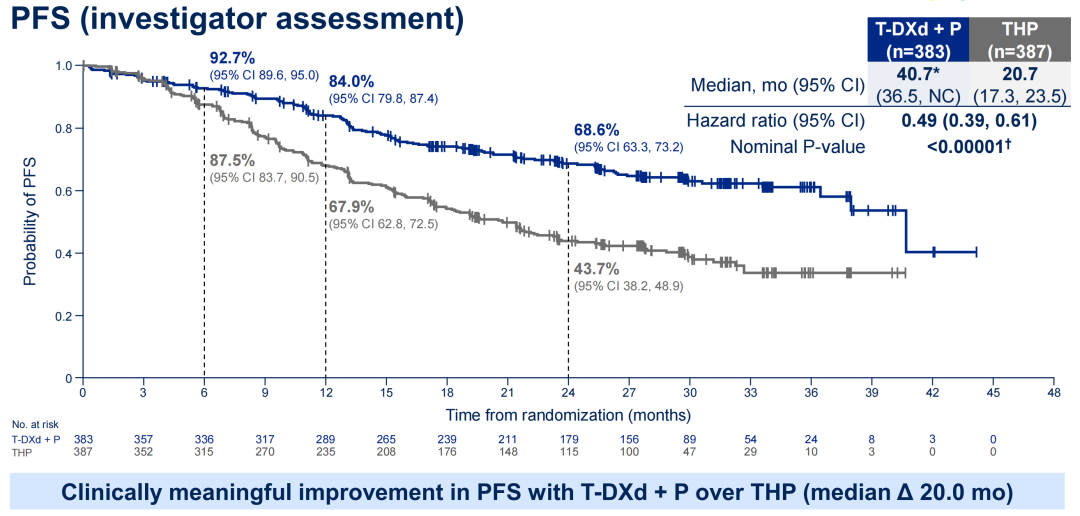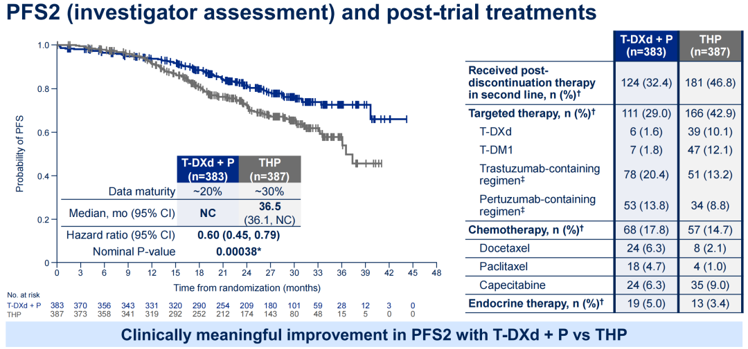 值得注意的是,此次DB-09研究的中期分析显示,T-DXd+P组的中位PFS2尚未达到,而对照组为36.5个月,风险比(HR)为0.6(95%CI:0.45-0.79,P=0.00038),意味着T-DXd+P组的PFS2事件风险显著降低了40%。此外,DB-09研究中T-DXd+P组的完全缓解(CR)率达到了15.1%,这意味着15.1%的患者有可能实现长期生存。PFS2和CR被认为是预测OS的重要指标,可见DB-09研究非常有可能获得OS阳性结果。因此,对于HER2+mBC此类本身侵袭性较强的肿瘤,尽早使用“好药”可能具有更好的远期生存获益。