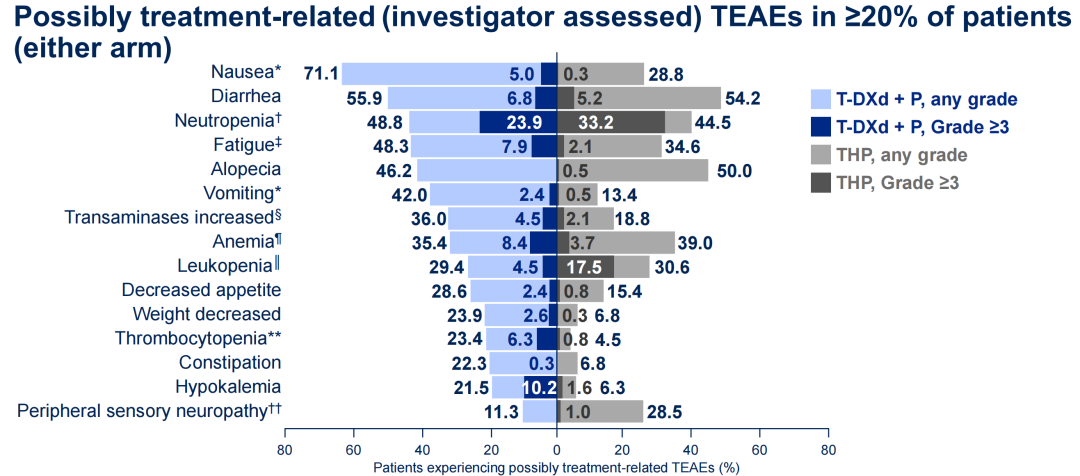从安全性角度来看,T-DXd+P联合治疗组的不良事件谱与既往报道T-DXd和帕妥珠单抗相关研究一致,未发现新的不良事件。T-DXd+P常见的任意级别治疗期间不良事件(TEAEs)主要包括恶心(71.1%vs 28.8%)、腹泻(55.9%vs 54.2%)、中性粒细胞减少(48.8%vs 44.5%)、乏力(48.3%vs 34.6%),且大多数不良事件发生率与化疗组相似。T-DXd+P组的耐受性良好,停药率低于化疗组(20.7%vs 28.3%);而且间质性肺病(ILD)和心脏毒性等特殊不良事件风险并未增加。