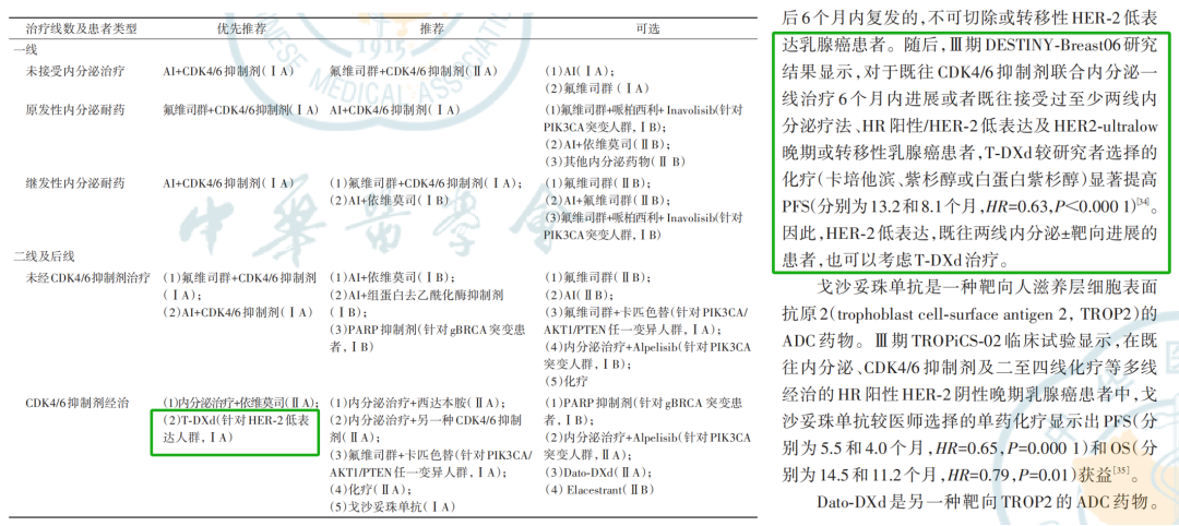 总体上,NCCN、ESMO指南对于CDK4/6i+ET经治患者,推荐基于gBRCAm、ESR1m、PAM通路变异、HER2表达状态等选择相应的精准治疗策略。在已报道的post-CDK4/6i相关III期临床试验中,单药PARP抑制剂或PAM通路抑制剂的中位PFS约为6.7~7.8个月,单药新型SERD约为3.8~5.8个月,而新型HER2 ADC已经超越1年[6]。在2025年第一次更新的NCCN乳腺癌指南中,以及2025年4月更新的ESMO MBC在线指南中:均将T-DXd的应用范围从以往的HER2低表达(IHC+,或IHC 2+且FISH-)扩大至HER2超低表达(轻度膜染色的IHC 0);并且将治疗线序提前至未接受过化疗的患者;此外,对于有内脏危象的HER2低或超低表达患者可接受T-DXd一线解救治疗。这些更新主要基于DESTINY-Breast06(DB-06)研究的报道,针对ET失败且未接受过化疗的HR+/HER2低或超低表达患者,T-DXd可相较于化疗显著改善全体患者的PFS(13.2 vs 8.1个月,HR 0.62,95%CI:0.52~0.75,P<0.001),且HER2低表达(HR 0.62)和超低表达(HR 0.78)患者显示了一致的PFS获益[7]
