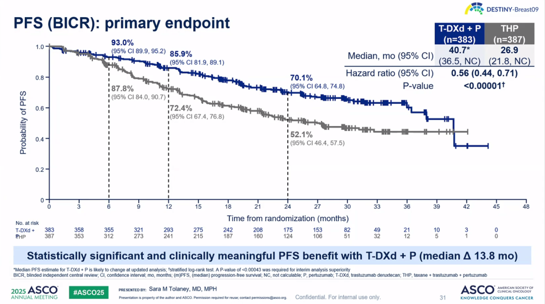 [1]Sara Tolaney,et al.Trastuzumab deruxtecan(T-DXd)+pertuzumab(P)vs taxane+trastuzumab+pertuzumab(THP)for first-line(1L)treatment of patients(pts)with human epidermal growth factor receptor 2–positive(HER2+)advanced/metastatic breast cancer(a/mBC):Interim results from DESTINY-Breast09.J Clin Oncol 43,2025(suppl 17;abstr LBA1008)
