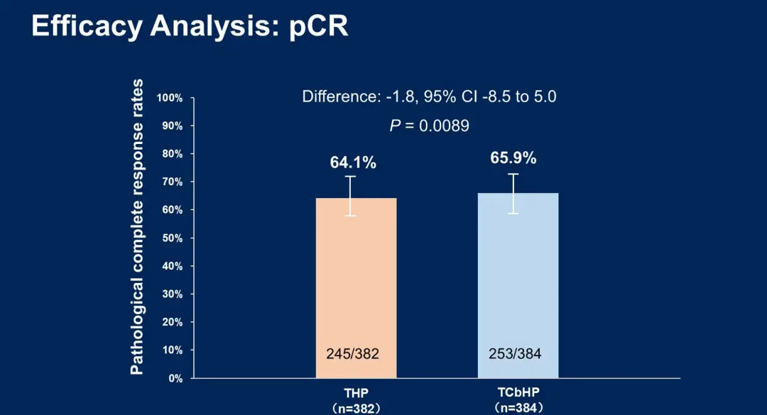其一是广东省人民医院王坤教授领衔的neoCARHP研究。该研究针对HER2阳性早期乳腺癌,头对头比较了去卡铂的THP方案与含卡铂的TCbHP方案的疗效。结果显示,THP方案pCR率非劣效于TCbH方案,为64.1%vs 65.9%(绝对差异为-1.8%,95%CI:-8.5-5.0;优势比0.93,95%CI:0.69-1.25;P=0.0089),且毒性更低。该研究通过减少一种药物的使用,可以显著降低患者的毒副作用,同时保持疗效甚至可能提高疗效,无疑是一个极具价值的发现[6]。