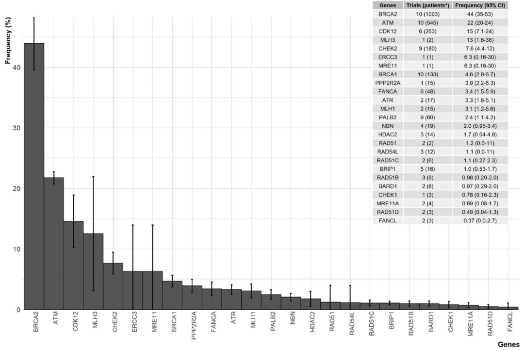 图2.PARP抑制剂试验中基因改变的合并频率