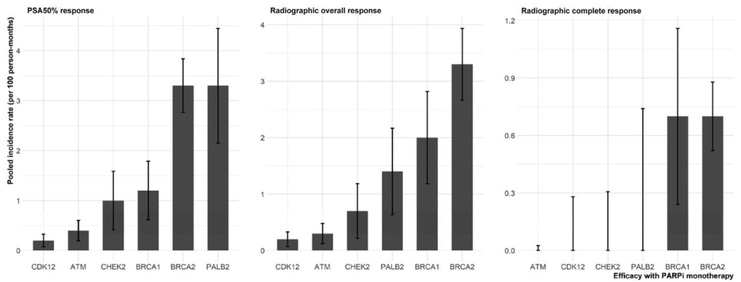 影像学应答:BRCA2突变患者的影像学ORR为3.3/100人月,BRCA1为2.0/100人月,PALB2为1.4/100人月;ATM、CDK12、CHEK2突变患者ORR均低于1/100人月。