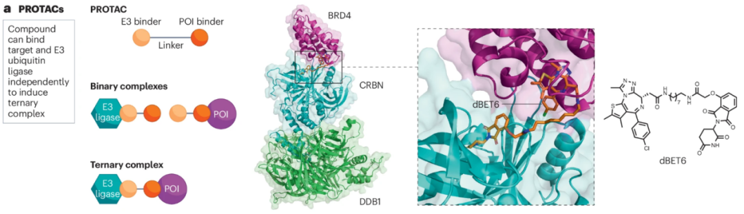 图3.PROTACs的机制示意图。PROTACs通过诱导或增强E3泛素连接酶与目标蛋白(POI)之间的相互作用,促进泛素转移和目标蛋白降解,它是异源双功能化合物,由两个分别结合E3连接酶和目标蛋白的配体组成,并通过一个化学连接体连接。例如,dBET6通过将BET蛋白BRD2–BRD4与CUL4–DDB1–CRBN E3连接酶复合体连接起来,从而降解这些蛋白。(图源:参考文献[1]