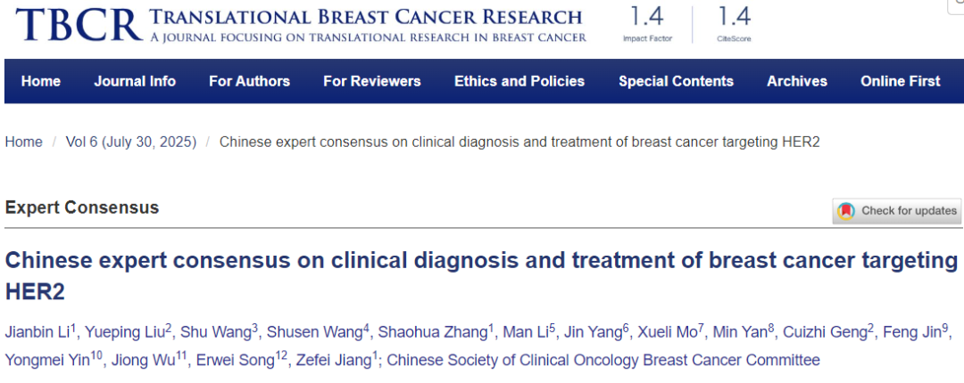 《肿瘤瞭望》:由您领衔编写的《靶向HER2乳腺癌诊疗中国专家共识(2025版)》(以下简称靶向HER2诊疗共识)英文版也在近期正式见刊,请您分享一下本次共识更新的意义是怎样的?
