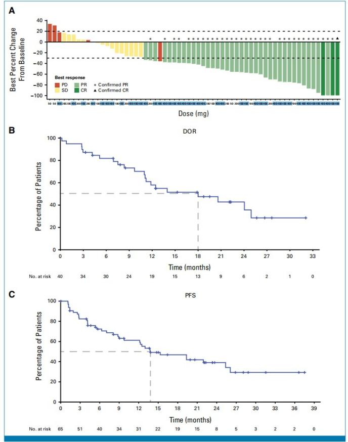 研究结果:数据分析时,非小细胞肺癌队列纳入65例患者,其中,400 mg、200 mg、100 mg、50 mg,分别入组44例、10例、5例和6例患者,数据分析时,26%的患者仍然在接受研究药物治疗,任何级别治疗相关不良反应发生率为93.8%,3度以上治疗相关不良反应发生率为16.9%,较常见的为腹泻3.1%,谷丙转氨酶升高6.2%,谷草转氨酶升高4.6%,乏力1.5%,恶心1.5%,整体人群的ORR为55.6%,中位DoR为18.0个月,中位PFS为13.8个月。