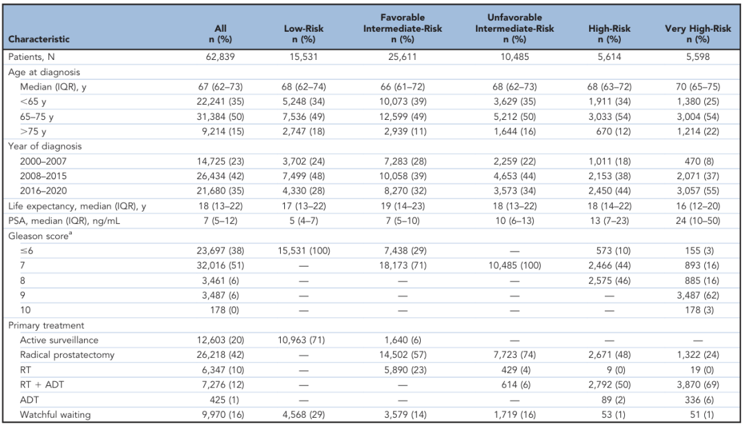 研究纳入2000年至2020年间的62,839名按照NCCN前列腺癌指南进行治疗的患者。中位年龄67岁(四分位距,62-73岁),中位预期寿命为18年(四分位距,13-22年),各风险类别的治疗方案相似。最常见的治疗方法是根治性前列腺切除术(42%;n=26,218),其次是放疗±ADT(22%;n=13,623)和主动监测(20%;n=12,603)。生存分析纳入了截至2008年1月1日仍存活的61,634名(98%)男性。随访结束时,2,636名男性(4.3%)死于前列腺癌,10,799名(18%)死于其他原因,48,199名(78%)被删失。